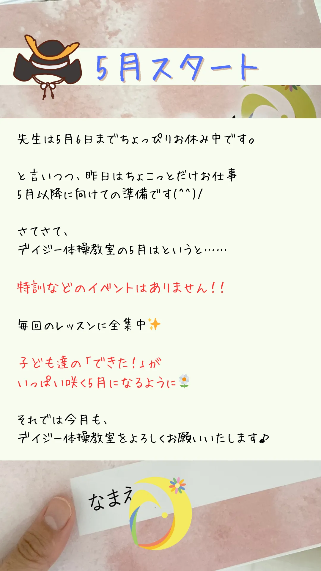 こんにちは!5月がスタートしましたね ゴールデンウィーク、いかがお過ごしでしょうか?先生は5月6日までちょっぴりお休み中です。と言いつつ、昨日はちょこっとだけお仕事5月以降に向けての準備です(^^)…